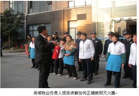 当日下午四点,防火演练正式开始。首先,尚城物业王经理向全体员工讲解了火灾现场如何进行营救并演示了如何使用干粉灭火器和消防水带,然后在场的每个员工轮流练习使用灭火器扑灭火桶,保安人员练习用消防水带进行灭火。这些练习有助于他们今后遇到火灾时能熟练扑灭火势,防止火灾扩大化。